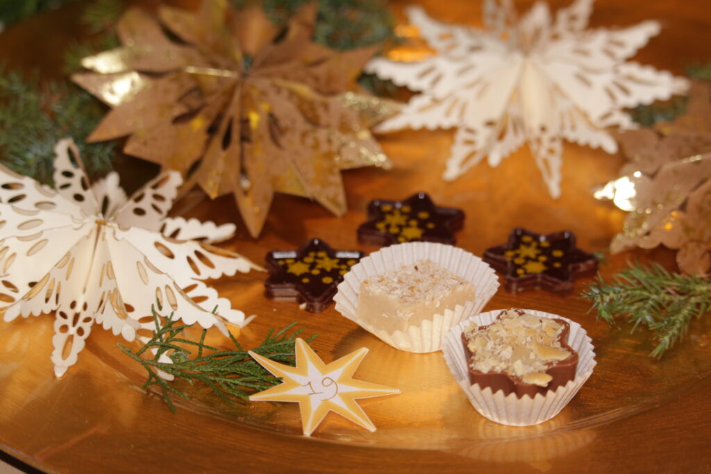 Für alkoholfrei und marzipanfrei gibt es das feine Vanille-Nougat mit Kokos, im Premium-Kalender finden Sie das schöne helle Mandelnougat.